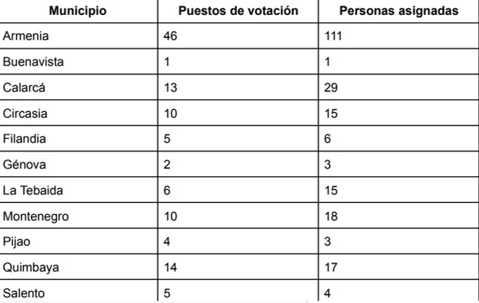 La siguiente es la distribución de los puestos de votación habilitados y el número de personal asignado para apoyar la jornada por municipio.