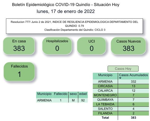 Los contagios se reportaron en Armenia con 332, Circasia con 13, Calarcá con 12, Montenegro y Quimbaya con 7 cada uno, La Tebaida con 6, Salento con 4 y Filandia con 2 casos nuevos.