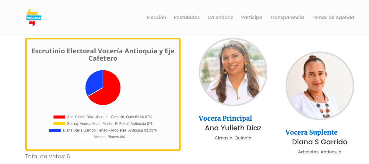 Ana Yulieth Diaz Ubaque, alcaldesa Circasia, será la encargada de representar a Antioquia y el Eje Cafeteroen la Red de Alcaldesas por la Democracia y la Paz. La mandataria será la vocera de los propósitos de la Red en los escenarios de consulta y diálogo político regional, nacional e internacional en esta zona del país, al mismo tiempo que liderará el trabajo colectivo de las alcaldesas en las regiones y visibilizará ante la opinión pública las demandas y posturas frente a hechos y decisiones que afecten la igualdad de las mujeres en los territorios, como los casos de violencia de género y violencia contra mujeres en política. Con el 66.67 % de la votación en esta región la mandataria circasiana fue elegida por encima de las alcaldesas de Arboletes y El Peñol, Antioquia. (Fuente Alcaldía)