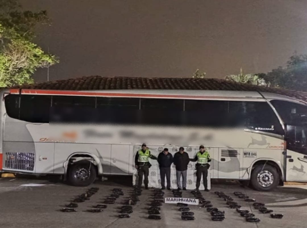 En el marco del plan vías seguras y control del transporte público desplegado en el departamento, la Seccional de Tránsito y Transporte logró la captura de 2 ciudadanos de 42 y 46 años de edad y quienes se movilizaban en un bus de servicio público, el cual al momento de realizarle registro al automotor se encontraron 69 paquetes de sustancia vegetal tipo Marihuana con un peso aproximado de 35.7 kilogramos.