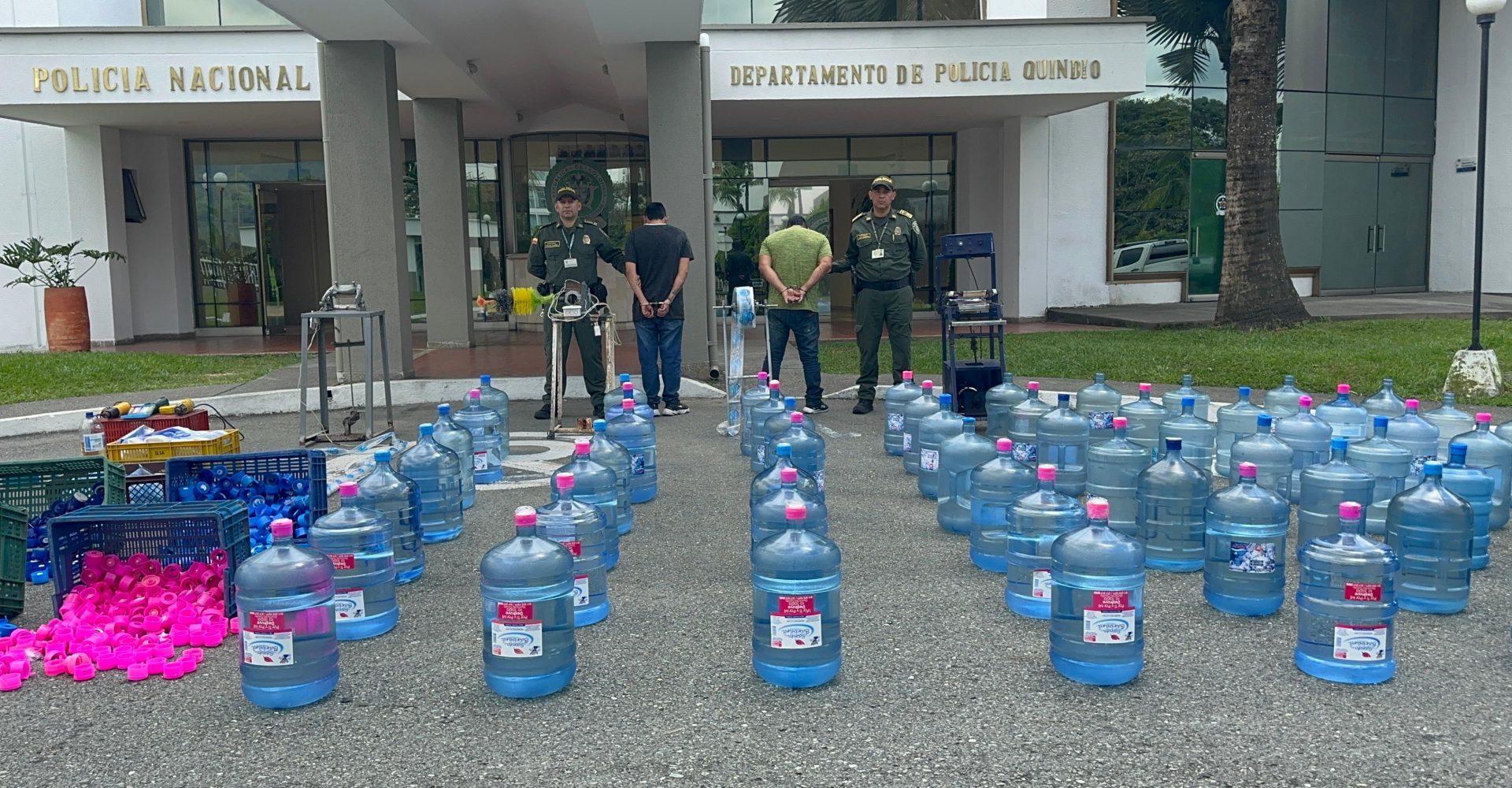 En una operación realizada en el barrio El Recreo, la Sijín del Quindío capturó a dos hombres de 22 y 46 años por embotellar agua ilegalmente, utilizando marcas registradas sin autorización.