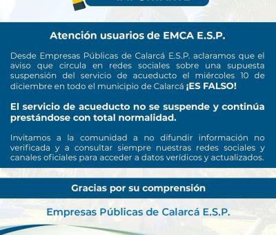 Leer másDesde Empresas Publicas de Calarcá han informado que para este próximo lunes 22 de diciembre habrá una suspensión temporal del servicio de acueducto e