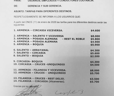 Leer másLa empresa de transporte intermunicipal que operan en el corazón del Eje Cafetero ha oficializado los nuevos valores en sus pasajes para este inicio d