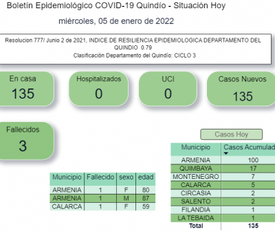 Leer másSegún el boletín epidemiológico de la secretaría de Salud departamental, hoy se registraron 135 casos nuevos de Covid-19 en el Quindío, se reparten de