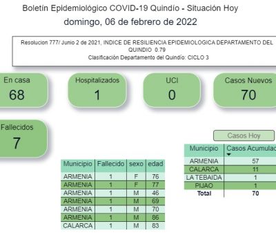 Leer másSegún el boletín epidemiológico de la secretaría de Salud departamental, se registraron 70 casos nuevos de Covid-19 en el Quindío hoy, de los cuales u