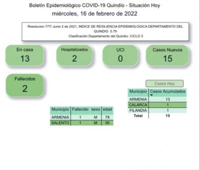 Leer másSegún el boletín epidemiológico de la secretaría de Salud departamental, hoy se registraron 15 casos nuevos de Covid-19 en el Quindío, 2 hospitalizado