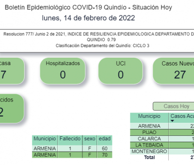 Leer másSegún el boletín epidemiológico de la secretaría de Salud departamental, hoy se registraron 27 casos nuevos de Covid-19 en el Quindío y 2 fallecidos.
