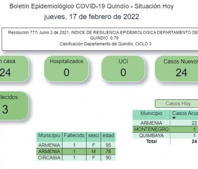 Leer másSegún el boletín epidemiológico de la secretaría de Salud departamental, hoy se registraron 24 casos nuevos de Covid-19 en el Quindío y 3 fallecidos.