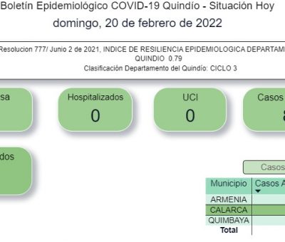 Según el boletín epidemiológico de la secretaría de Salud departamental, hoy se registraron 8 casos nuevos de Covid-19 en el Quindío y 0 fallecidos.