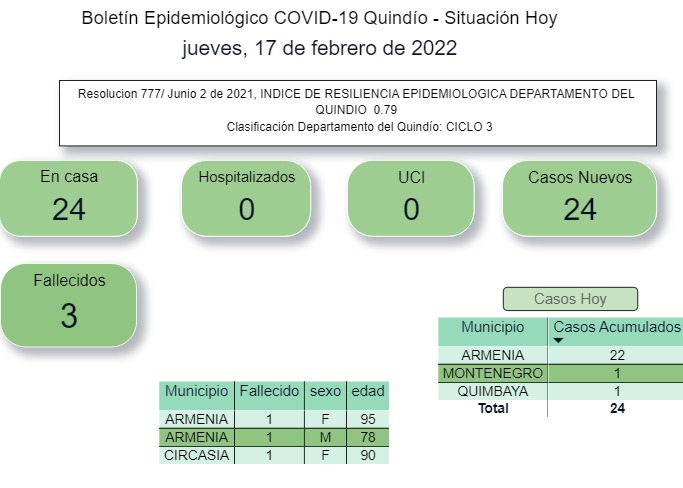 Según el boletín epidemiológico de la secretaría de Salud departamental, hoy se registraron 24 casos nuevos de Covid-19 en el Quindío y 3 fallecidos.