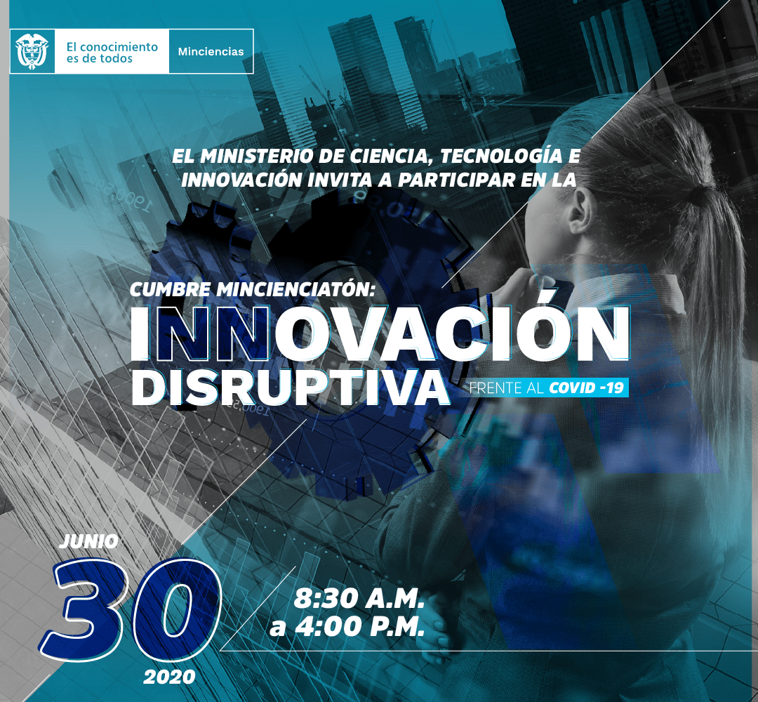 El Ministerio de Ciencia, Tecnología e Innovación, lo invita a participar el próximo 30 de junio en la Cumbre MinCienciatón: Innovación disruptiva frente al covid 19; un espacio que propiciará la interacción y fortalecimiento de redes entre los actores del Sistema Nacional de Ciencia, Tecnología e Innovación, la difusión en avances de la producción científica y desarrollo tecnológico colombianos, enfocados en atender la pandemia, aminorar sus efectos y ubicar al país como líder innovador de la región en este tema.