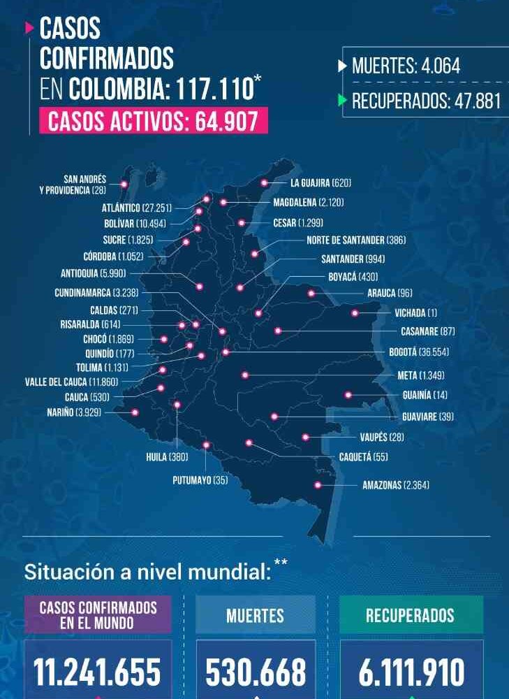 El Ministerio de Salud colombiano informó de 122 muertes por COVID-19 con lo cual el país acumula 4.064 fallecidos, en una jornada en la que fueron confirmados 3.721 nuevos casos que elevaron a 117.110 la cifra total de contagios.