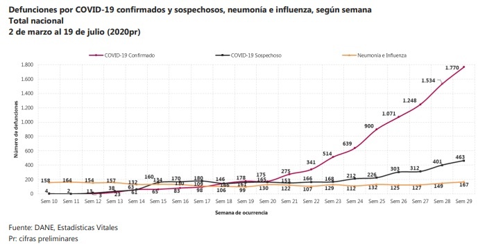 En datos entregados a la sala de redacción de Tribuna Popular de Transmisora Quindío, por parte de del DANE se señaló que, el 19,4% de las muertes a causa del COVID-19, se registraron del 13 al 19 de julio, y el 16,8% se reportaron en la semana inmediatamente anterior (6 al 12 de julio). Por otra parte, el 13,2% de los fallecimientos por COVID-19 sospechoso ocurrieron en la semana 29, y el 11,4% se reportaron en la semana 28.