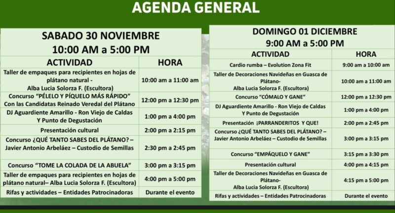 Además, habrá una nutrida programación cultural y artística, con actividades que incluyen presentaciones y concursos, mientras que en la parte de artesanías, se expondrán diseños y creaciones inspirados en el plátano. Las charlas temáticas complementarán la experiencia, abordando aspectos relacionados con la producción, transformación y comercialización de este producto emblemático.