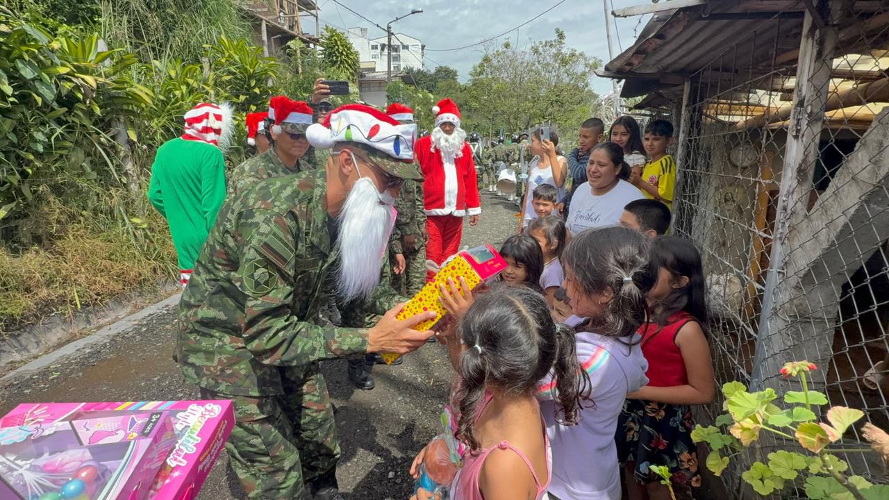 La jornada inició con la presentación de la banda de guerra del batallón, que recorrió las calles principales de estos barrios con interpretaciones marciales y ritmos festivos. A la actividad se sumaron soldados caracterizados como personajes icónicos de la Navidad, entre ellos Papá Noel, quienes interactuaron con la comunidad y facilitaron un espacio de integración ajeno a las operaciones militares cotidianas.