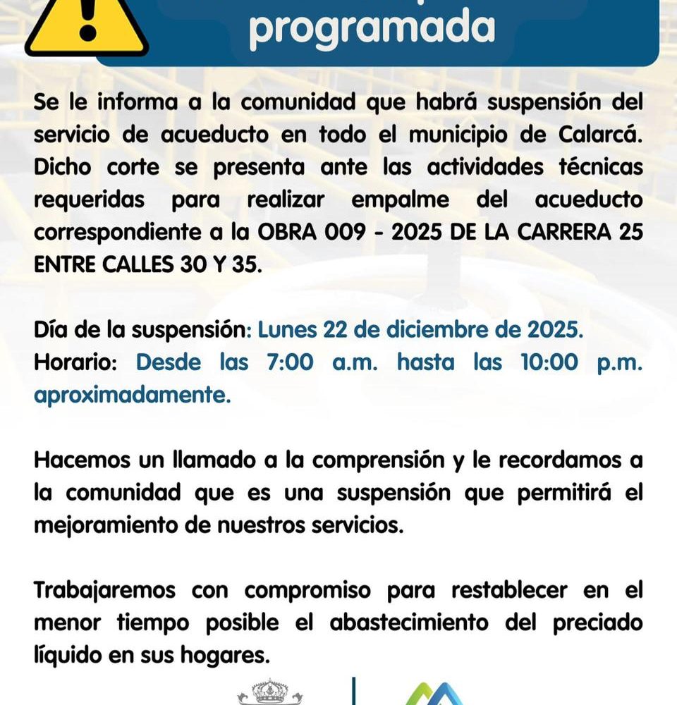 Desde Empresas Publicas de Calarcá han informado que para este próximo lunes 22 de diciembre habrá una suspensión temporal del servicio de acueducto en el todo el municipio de Calarcá.