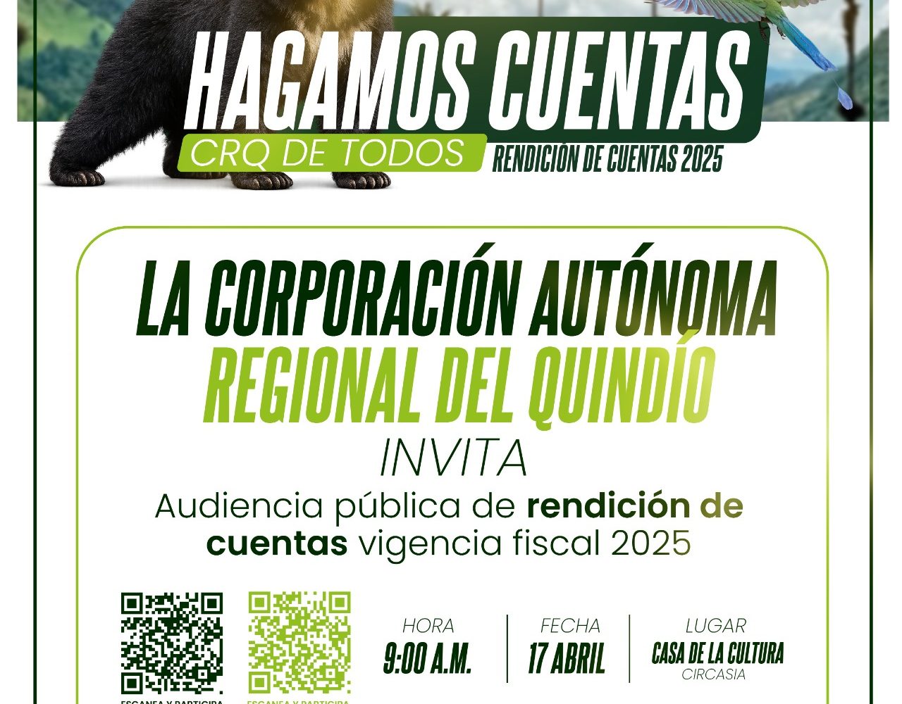 La Corporación Autónoma Regional del Quindío extiende invitación a toda la ciudadanía a la rendición de cuentas de la vigencia fiscal del 2025 que se realizará el viernes 17 de abril a las 9AM en la Casa de la Cultura del municipio de Circasia.