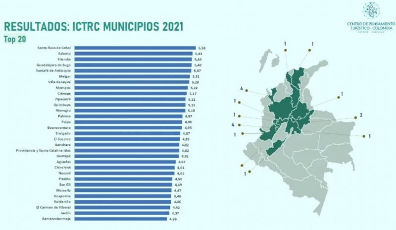 La medición del 2021 se realizó en los 32 departamentos y el Distrito Capital, 25 ciudades capitales y 174 municipios con vocación turística. Además de los departamentos con primeros puntajes aparecen los municipios de Santa Rosa de Cabal, Risaralda; y Salento y Filandia, en el Quindío.